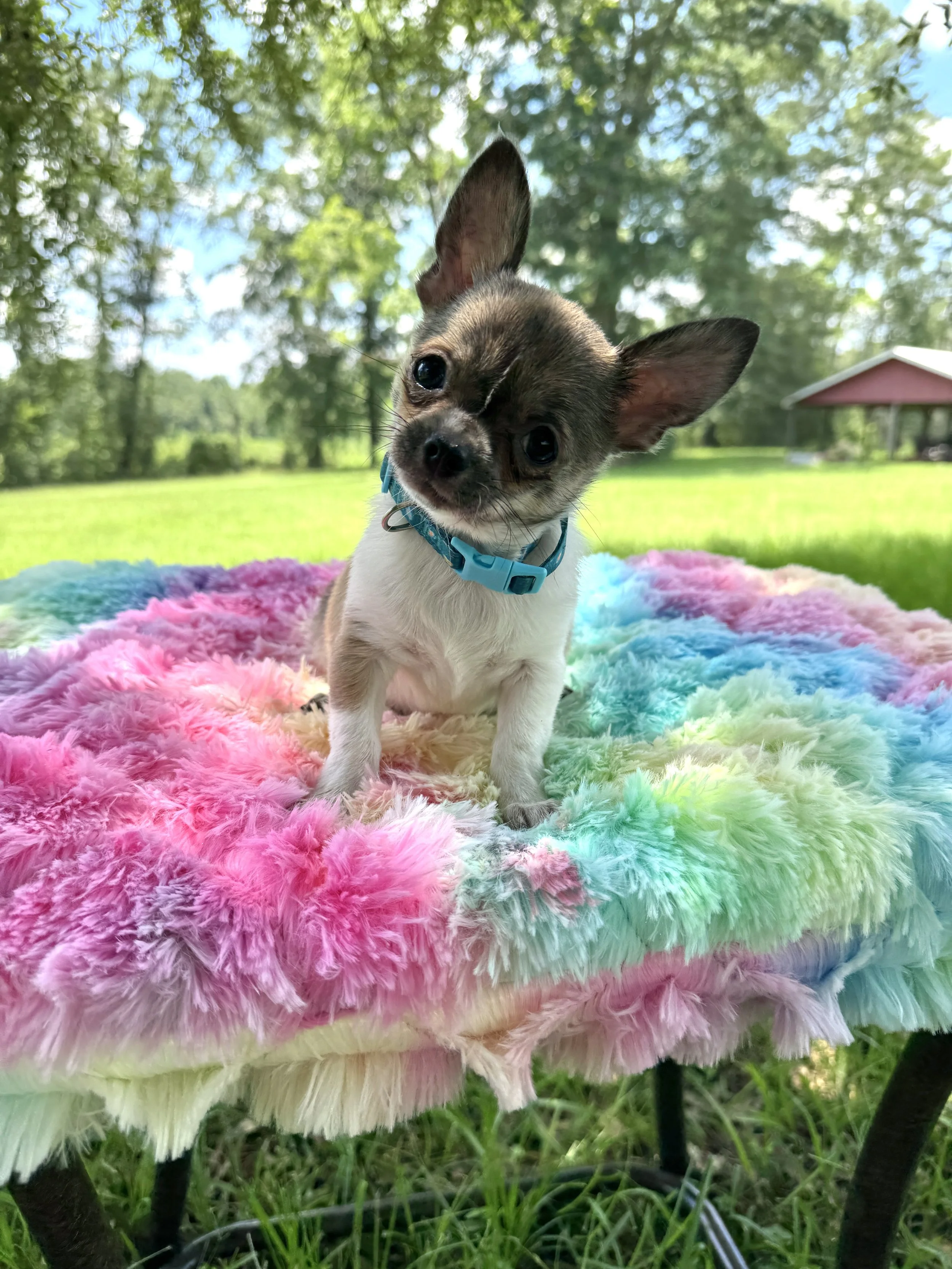 Elroy is a beautiful blue brindle, spotted on white, boy from Fiddlefigg Chihuahuas in North Carolina. While he is not turning out for our breeding programs, he is an AMAZING companion. Such a wonderful, happy-go-lucky temperament that anyone would die for.